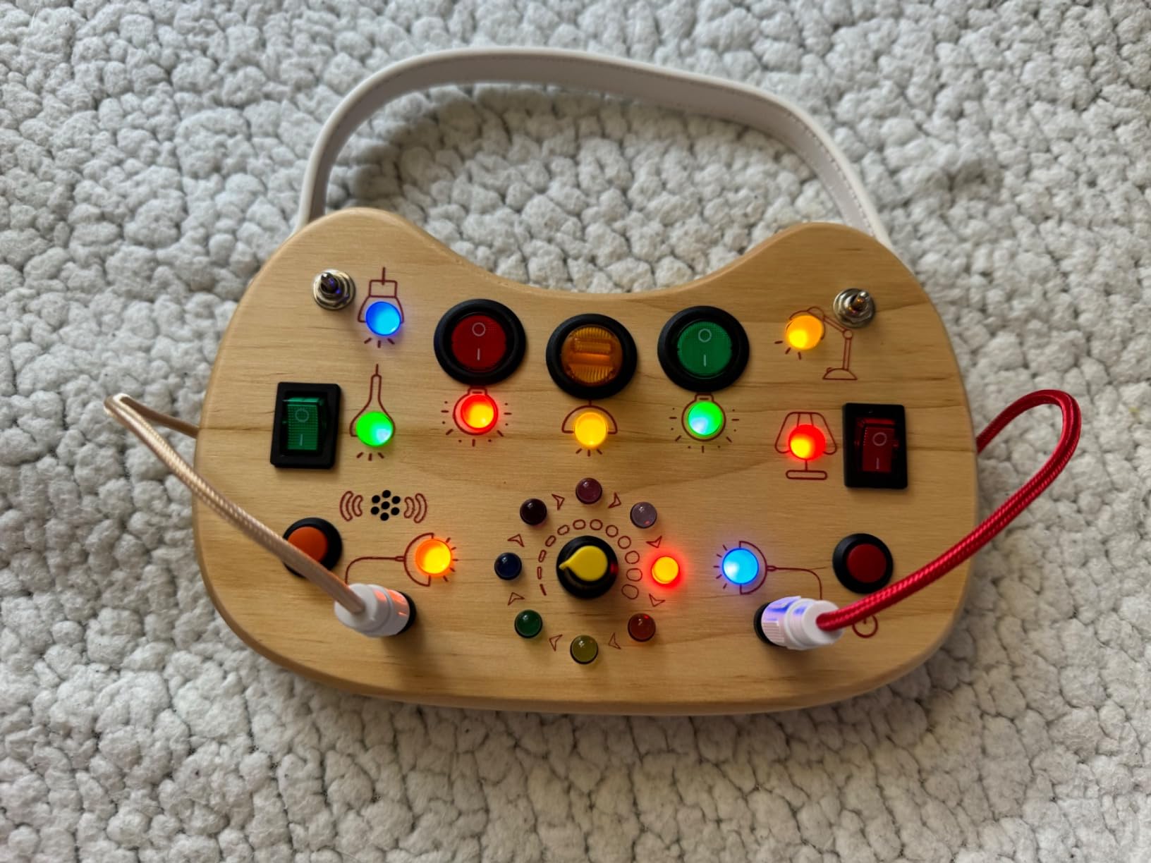 Engage your toddler with this Montessori-inspired wooden busy board featuring switches, LED lights, and interactive sensory elements. Ideal for ages 3–7, it’s a perfect travel toy designed for early learning and fun in London homes.