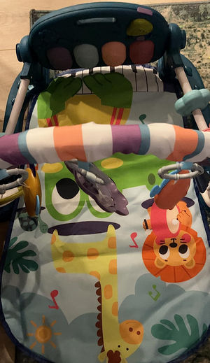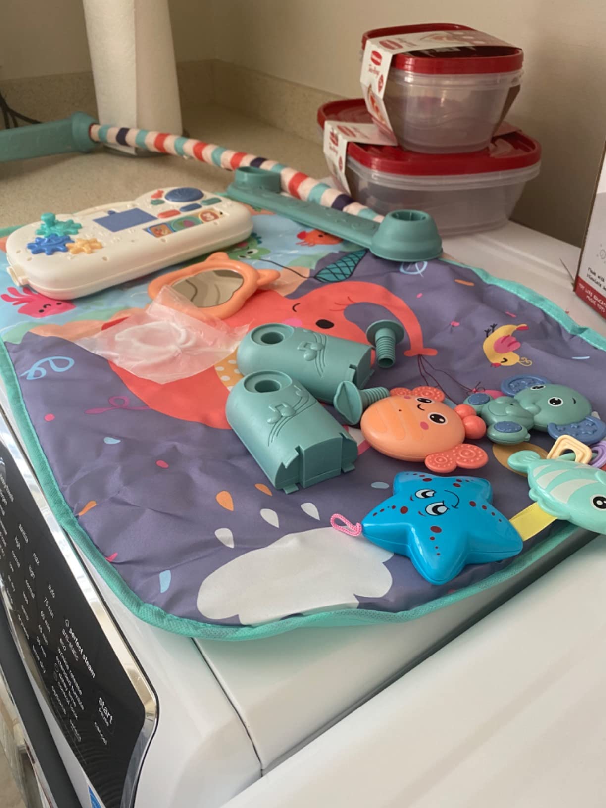 Got this for great grandson who has begun teething and hoping it would be a distraction so my grandson and his wife could have a breather and baby could wear himself out. The baby is 3 months old and loves this mat. It’s brightly colored and cheerful and has a bridge like rainbow of colors over him to keep him safe. The ad is easily cleaned and I love videos they send me with baby actively kicking and playing. Worth every dime.