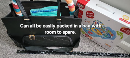 Would have been perfect with a bag or straps for travel but I am happy with this play mat. The toys included are nice but interchangeable with any other toy that you would like by just using the colored rings to hang something else that your baby likes. Getting a whole rattle was unexpected though and my baby likes it the best.