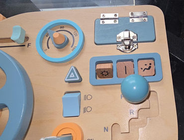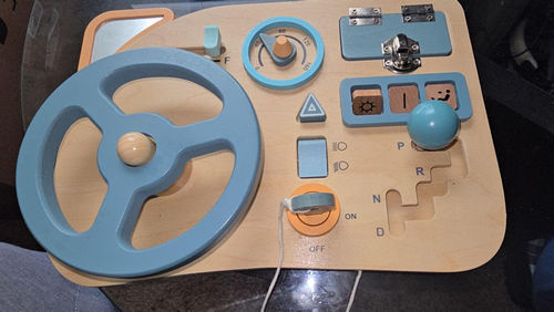 A fun and educational Montessori busy board featuring a wooden steering wheel and interactive elements to boost motor skills, coordination, and sensory development. Ideal for toddlers at home or on the go.