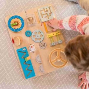 A wooden busy board designed for toddlers, featuring interactive activities to support sensory play, motor skills, and early learning. Safe, durable, and perfect for travel, it encourages creativity and independent play for children aged 12 months and above.