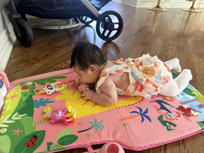 Adorable tummy time mat! This has been a hit with all my babies and this one is no exception. It’s similar to the name brand with the same fun features. Bright colors, cute patterns and plenty of noise and teether toys. Smaller babies who kick naturally will hit the piano keys and activate the music! Easy to take apart and store. Great price too!