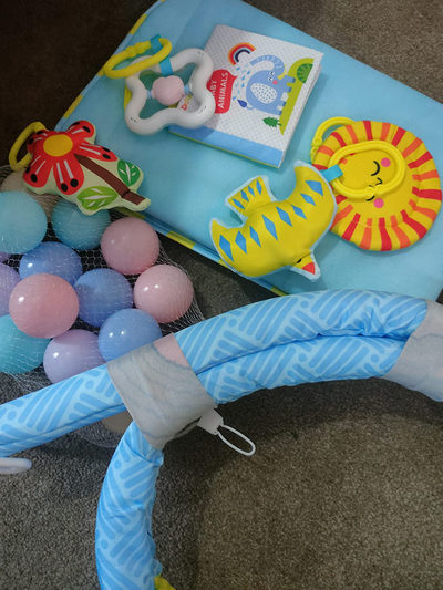 I love this play gym! It is easy to put together and contains a lot of stimulation for the little one. The little net around generally keeps the balls in — as long as the little one doesn’t want them outside. It is very lightweight, so you can move it around as needed. The bottom is not padded or anything, just there to keep it together, so I keep it on a larger playmat.