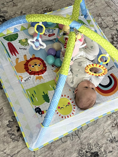 So much more than a mat—it’s a whole baby entertainment center! Bright colors, fun textures, and hanging toys keep my little one engaged, , easy to clean, and folds up nicely when not in use. A must-have for tummy time and playtime
