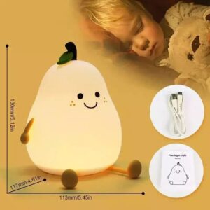 Soft silicone pear night light with tap-to-dim brightness and USB charging. Safe, portable, and perfect for kids’ rooms, nurseries, or bedside use in UK homes.